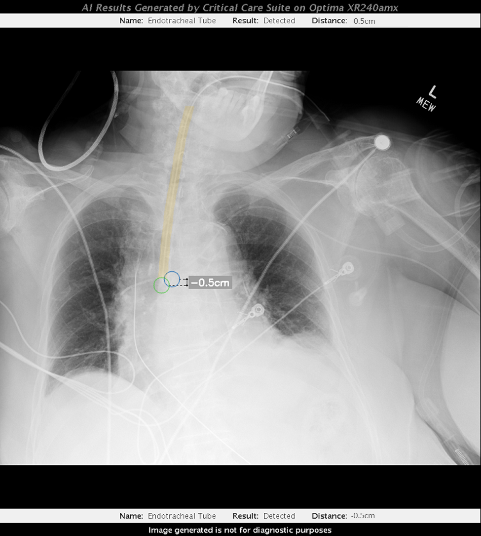 GE’s AI detects the end of the tube, calculates its distance from the carina and displays the data on the X-ray monitor within seconds of capturing the image. That instantaneous feedback can help give clinicians more confidence in their work and help identify which patients need additional adjustment.