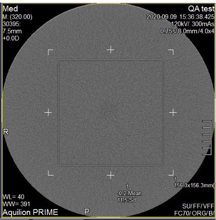 Perform any QA scans that are required by the facility and/or site physicist. The QA scans can be useful in checking for artifacts and any shift in CT numbers, indicating a possible problem with the scanner. Shown below is an example of a QA scan completed for a medium water phantom.