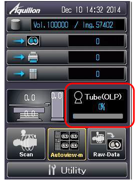 A tube warm-up should be done before a clinical scan when the tube OLP has dropped below 20%. Doing a tube warm-up before the clinical scan will prepare the tube for a potentially higher kV/mA exposure used during a clinical scan. These exposures should not be made on a cool tube, whenever possible. In the latest release software, you initiate a warm-up by clicking on the Tube(OLP) window on the main screen.
