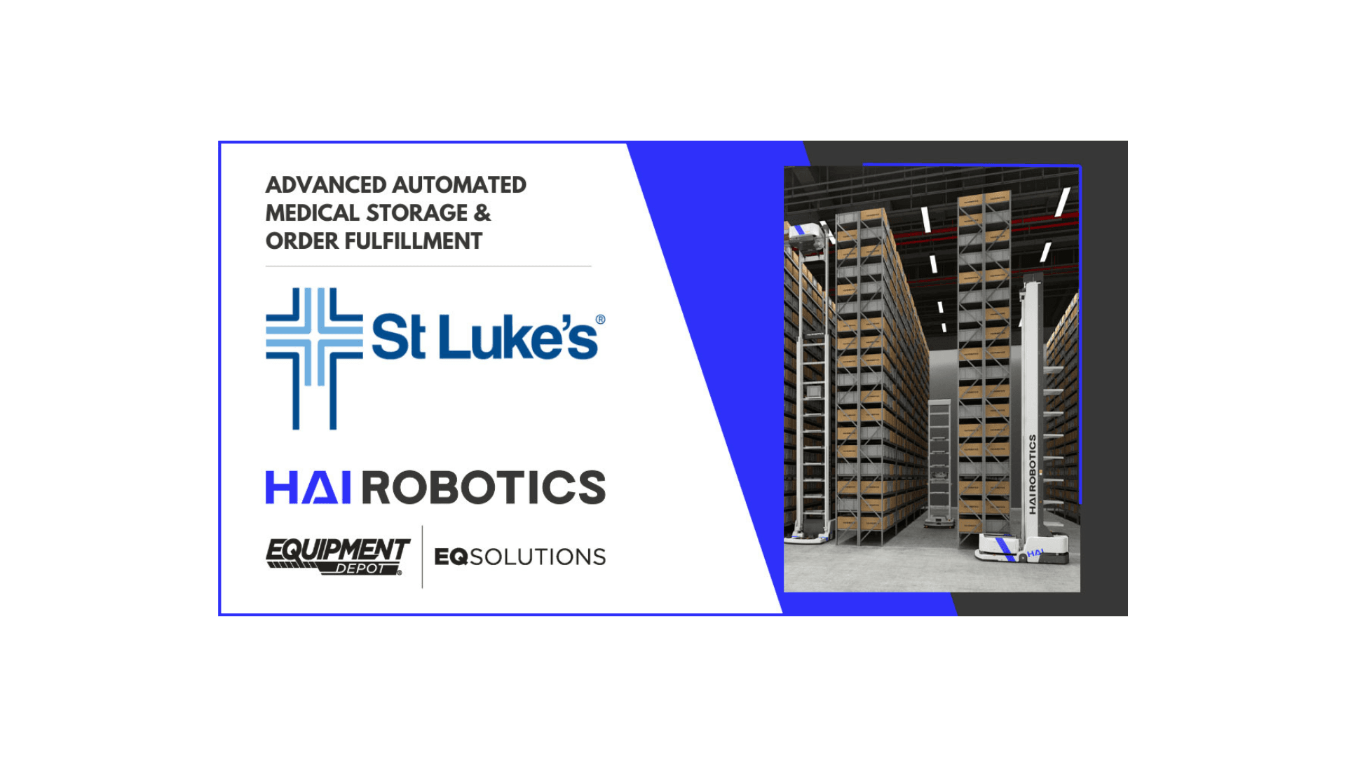 “EQSOLUTIONS and Hai Robotics perfectly marries Equipment Depot’s top-tier material handling expertise with Hai’s innovative ACR systems,” said Tim Raque, Director of Automation Sales for EQSOLUTIONS. “Our strategic alliance will empower St. Luke’s with the competitive efficiency, flexibility, and scalability needed to thrive in today’s fast-paced market.”