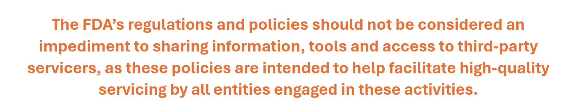 The availability of timely, cost-effective, quality maintenance and repair of medical devices is critical, both to the successful functioning of the U.S. health care system and the public health. The FDA’s regulations and policies should not be considered an impediment to sharing information, tools and access to third-party servicers, as these policies are intended to help facilitate high-quality servicing by all entities engaged in these activities.